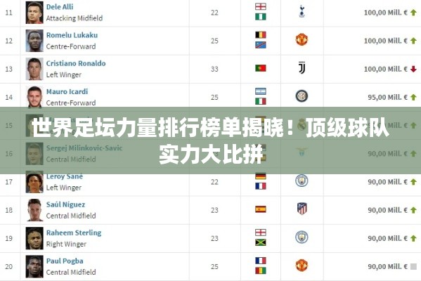 足球,这项全球最受欢迎的体育运动,汇集了无数激情与热血的瞬间,在这片广阔的舞台上,各国球队以其卓越的实力和辉煌的战绩,共同绘制出一幅绚丽多彩的画卷,本文将带你了解当前世界足坛的力量排名,探寻那些引领足球风潮的强队。